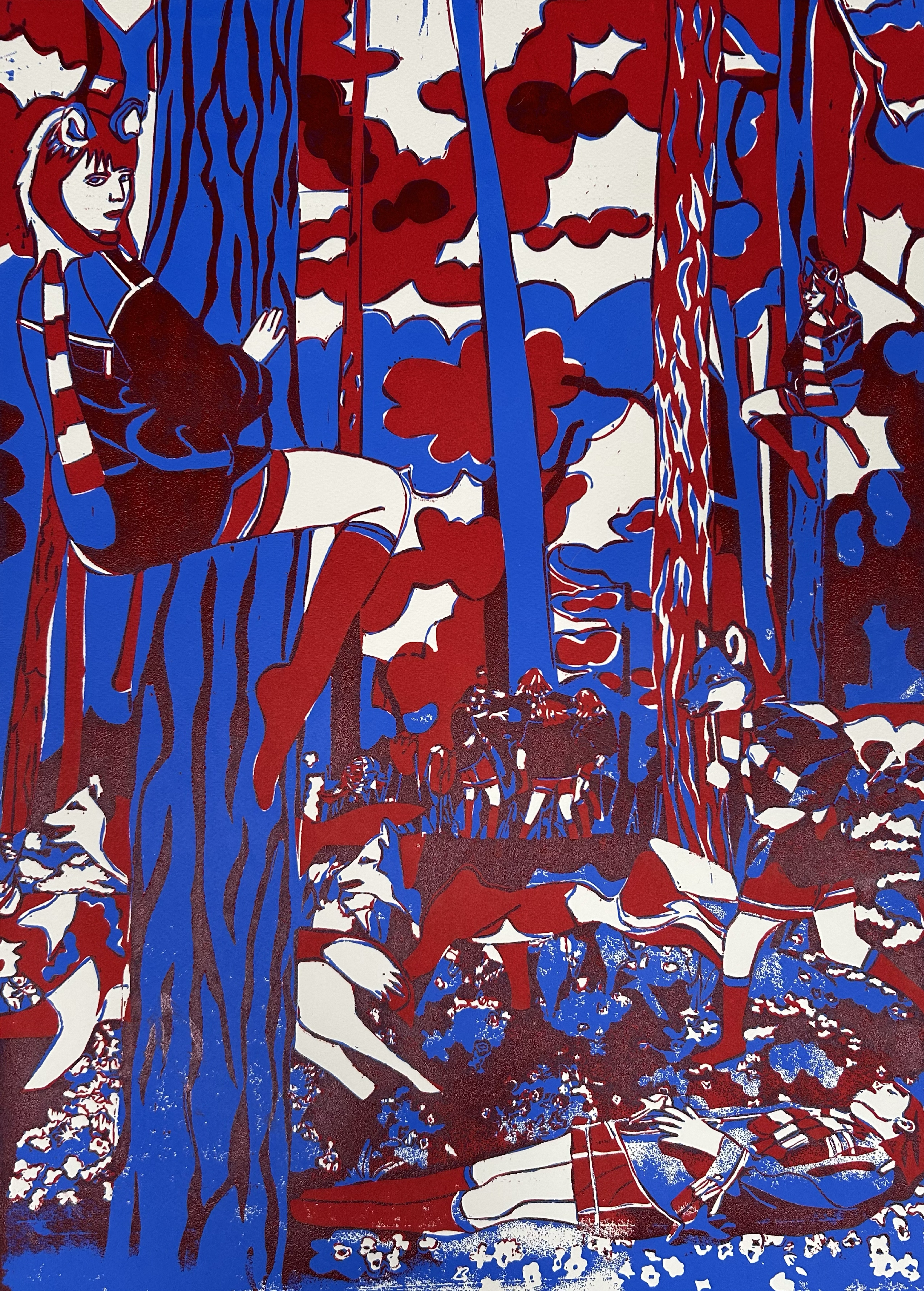 Inspired by a performance where I channelled my inner wolf through dance and meditation, the print reflects multiple joyful iterations of my queer self in the woods. Influenced by Peter Hujar's nature photography and Sally Gearhart’s ‘The Wanderground’, my work presents the forest as a healing space for all queer identities, including transgender and non-binary folk.